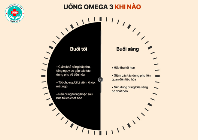 Nhiều nghiên cứu khoa học đã chỉ ra rằng Omega 3 có thể hấp thu tốt hơn nếu được uống vào buổi sáng. Nghiên cứu cũng khẳng định sau 14h khả năng hấp thu của Omega 3 sẽ bị giảm đi. Tuy nhiên, bởi vì Omega 3 là một axit béo không no nên bạn cần bổ sung nó trong bữa ăn và tốt nhất là 1 bữa ăn chứa nhiều chất béo.